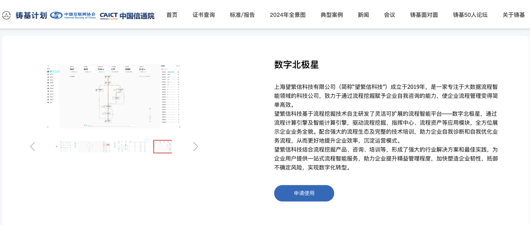 作者:發(fā)布時(shí)間:2024-09-24 近日,上海望繁信科技有限公司(以下簡(jiǎn)稱“望繁信科技”)的數(shù)字北極星流程智能管理平臺(tái),在中國(guó)信息通信研究院(以下簡(jiǎn)稱“信通院”)的評(píng)選中,榮獲2024年度數(shù)據(jù)治理技術(shù)解決方案獎(jiǎng)項(xiàng),并入選《高質(zhì)量數(shù)字化轉(zhuǎn)型產(chǎn)品及服務(wù)全景圖》。同時(shí),望繁信科技的數(shù)字北極星平臺(tái)成功首批入駐信通院鑄基計(jì)劃應(yīng)用商店。這一榮譽(yù)不僅突顯了望繁信科技在流程智能和流程挖掘領(lǐng)域的技術(shù)領(lǐng)先性,更表明其數(shù)字北極星平臺(tái)在推動(dòng)企業(yè)數(shù)字化轉(zhuǎn)型中的重要地位。
