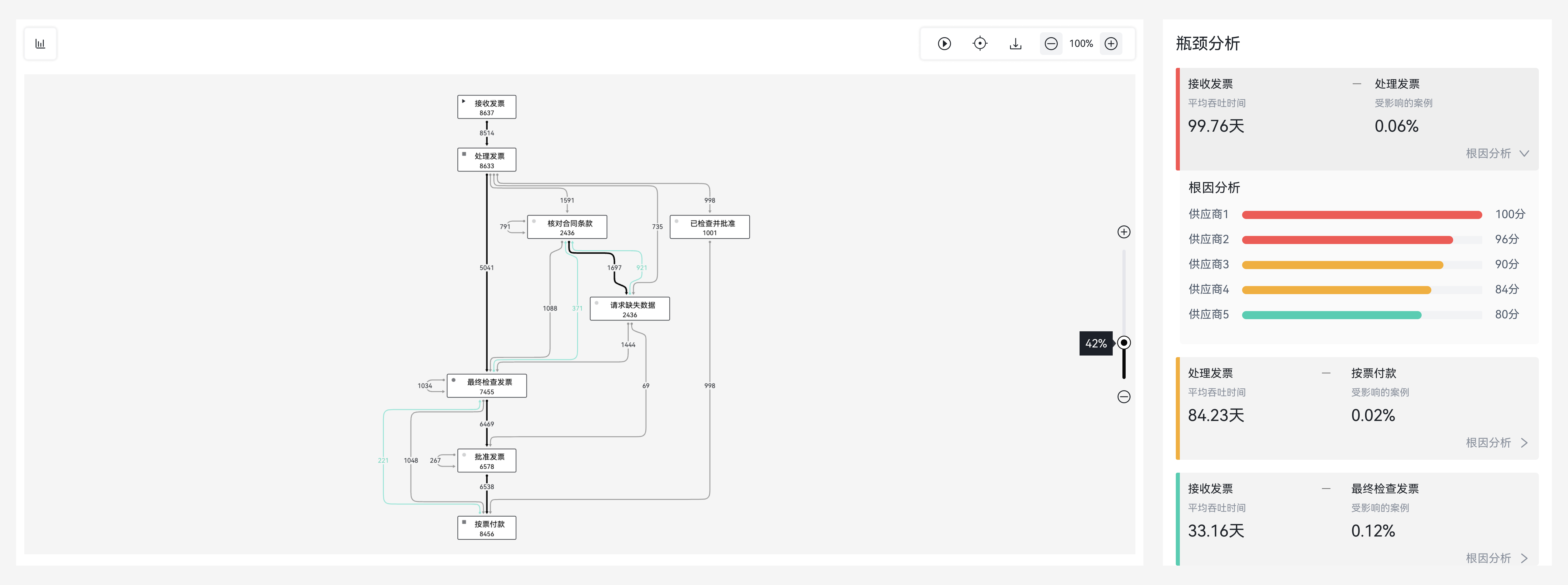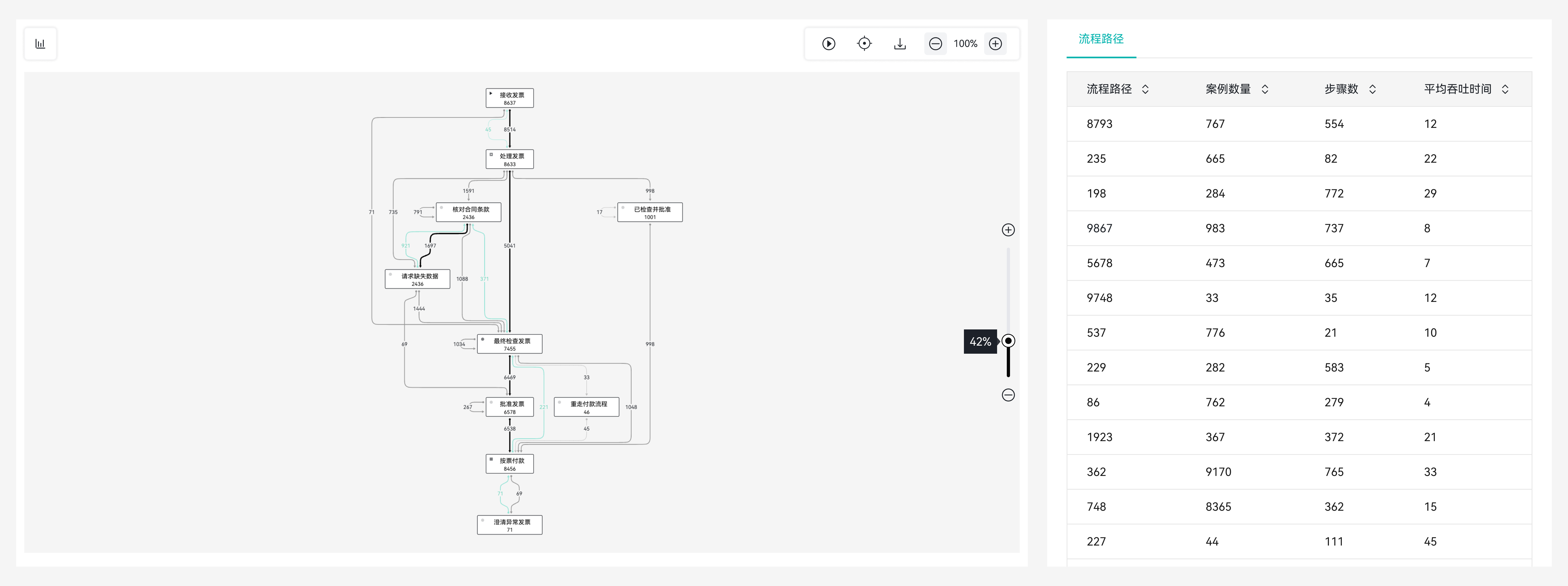 2、基于歷史真實(shí)流程數(shù)據(jù),通過內(nèi)置流程圖算法一鍵獲取最高頻流程路徑,快速總結(jié)作業(yè)標(biāo)準(zhǔn)流程。